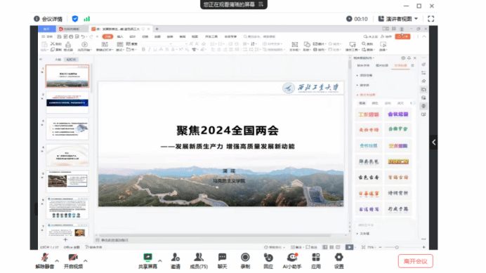 为全面贯彻党的二十大精神,推动学习贯彻习近平新时代中国特色社会主义思想入脑入心,进一步学习2024年全国两会精神,3月27日,beats365官网入口特邀公司马克思主义公司蒲瑶教授通过线上形式讲授题为《聚焦2024全国两会——发展新质生产力 增强高质量发展新动能》的专题党课。数学与统计公司党委理论学习中心组成员、教职工党员、员工党员代表共80人参加活动。党课由数学与统计公司党委书记王莉主持。