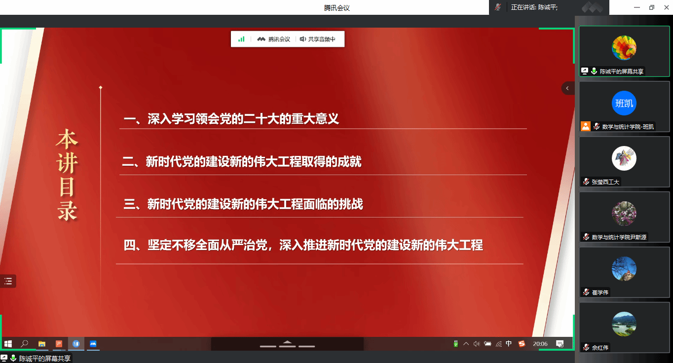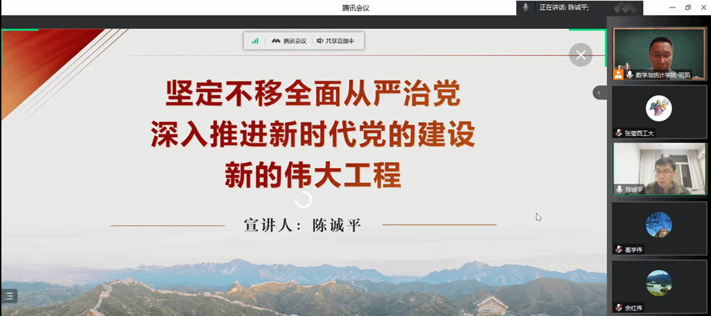 为进一步贯彻落实公司新学期《关于加强党的二十大精神学习宣讲的通知》内容要求,3月22日,beats365官网入口特邀公司马克思主义公司教师理论宣讲团陈诚平副教授作了题为《坚定不移全面从严治党,深入推进新时代党的建设新的伟大工程》专题党课。公司教工党支部全体同志,员工党支部代表,与公司数学科学系党支部共建支部西北大学基础数学系党支部代表通过线上形式共同参会。会议由公司经理助理班凯主持。