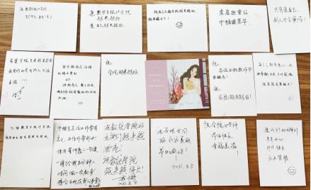 最后,教师们纷纷在小卡片上写下了各种祝福。“柔肩担重担、巾帼绽芳华”“每个人都有爱心,把它奉献出来才叫圆满”“借用董仲蠡的一句话,‘请给我5分钟的时间,做一次教育。’将会出现在我的课堂上”“努力把自己活得比昨天更好,是对所有人、对整个社会、对我们的祖国最好的回报”。一句句平实质朴的语言,诠释了最真挚细腻的情感。经理助理郭千桥作为男教师代表,也表达了对数统公司及各位女教师的美好祝福。