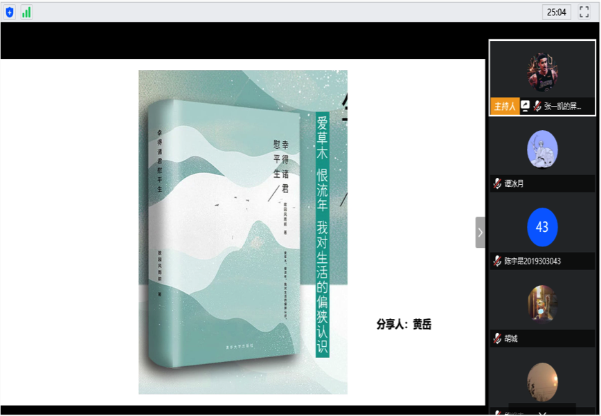 为了促进班级的文化氛围,鼓励同学们积极读书,2019级理学类本科DL071903班于4月25日举行了线上读书分享交流会,由大家推荐自己喜欢的书籍,共同阅读。
