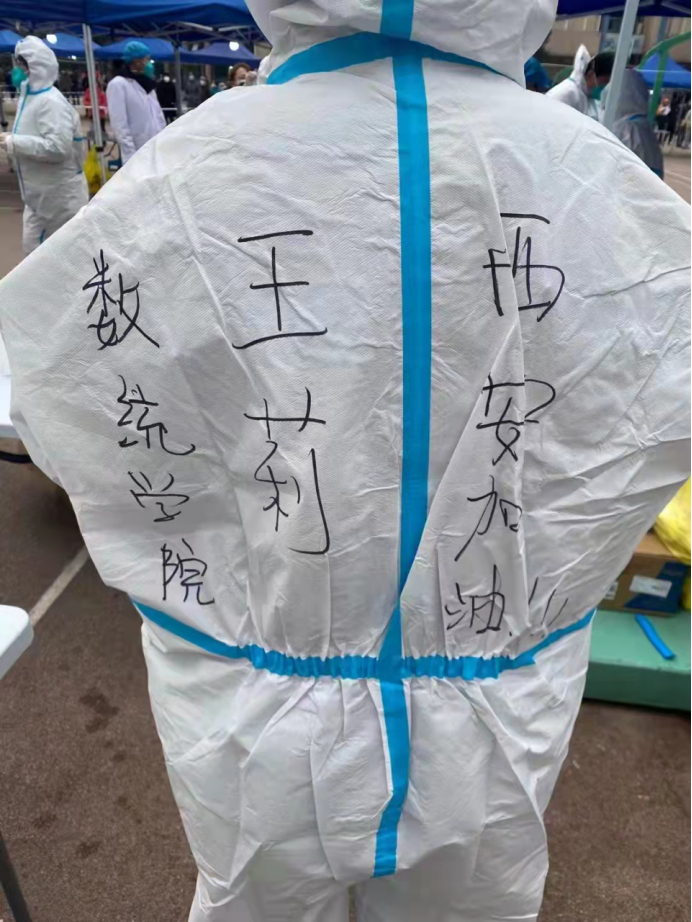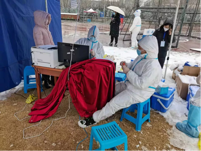 在友谊、长安校区的核酸检测工作现场,身穿“大白”防护服,负责为师生核对身份,检验西安“一码通”的是党委书记王莉、经理助理郭千桥、班凯、青年教师潘璐璐还有员工志愿者王彬、袁昊、王璎斐,几天的分批次工作下来,细心、严谨、寒冷是大家最大的感受,特别是长安校区的风雪天,更是让工作者印象深刻,用心地付出也势必会为全校师生们的健康编制好一面“安全网”。