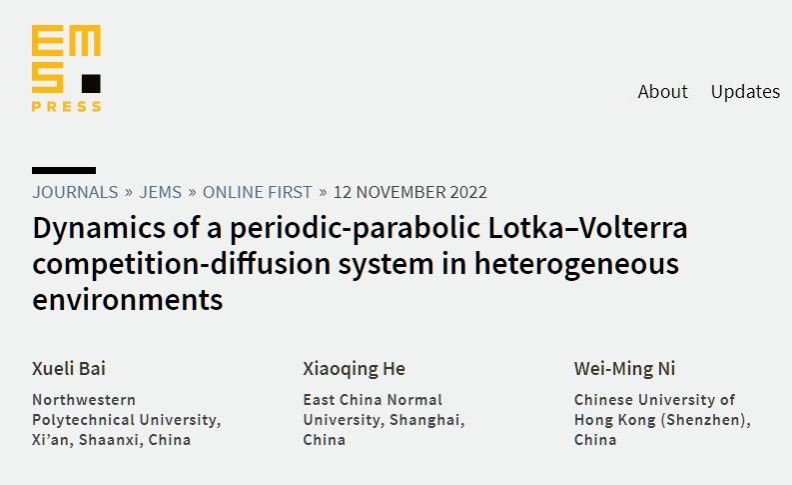 近日,beats365官网入口分析与几何研究团队副教授白学利与华东师范大学何小清教授、香港中文大学(深圳)倪维明教授合作在带有时间周期Lotka-Volterra竞争系统解的稳定性理论研究方面取得突破,研究结果形成的55页论文“Dynamics of a periodic-parabolic Lotka-Volterra competition-diffusion system in heterogeneous enviroments”在数学综合顶级期刊Journal of the European Mathematical Society在线发表。这是本年度国内学者在该刊发表的第5篇论文,也是公司首次在该顶级期刊发文。