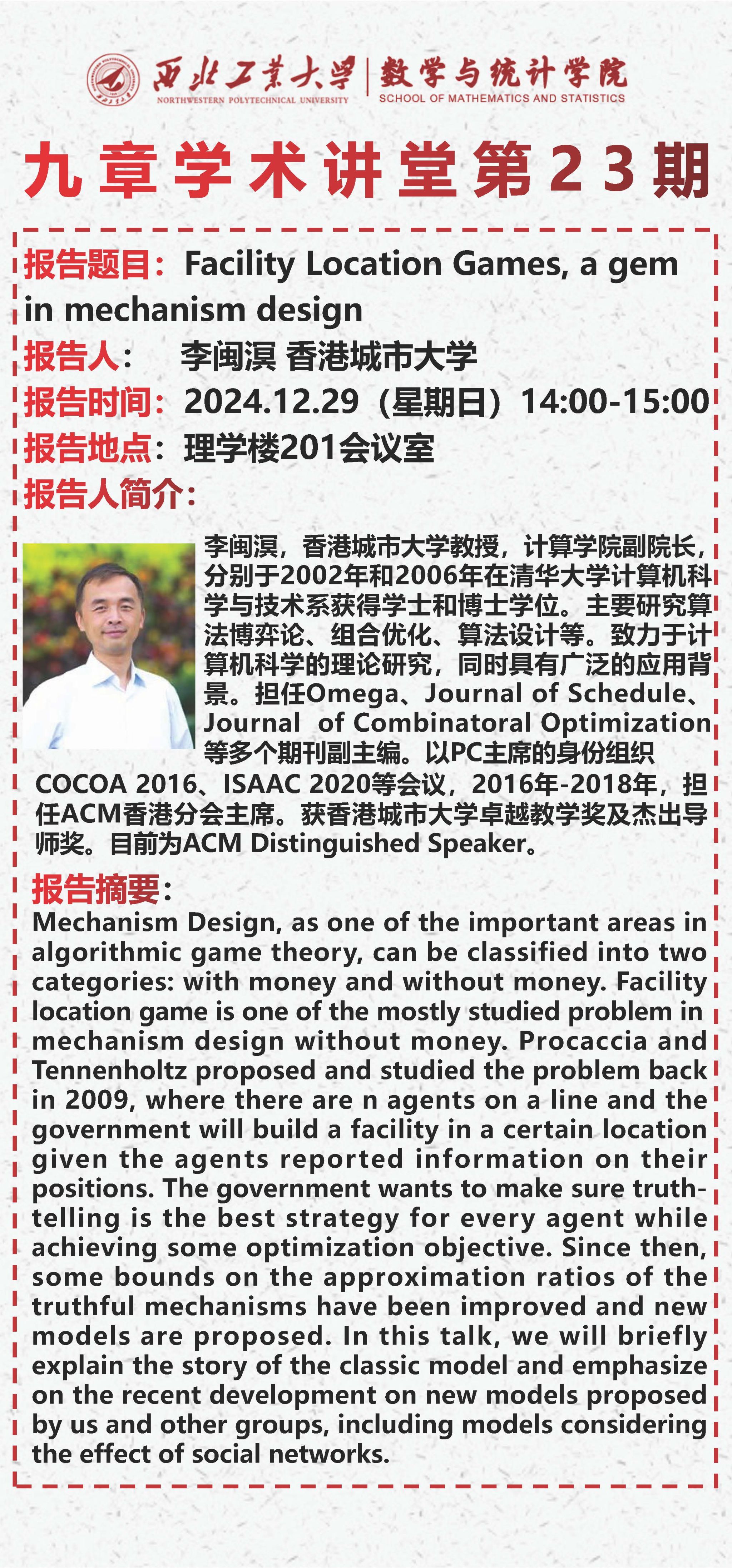 【九章学术讲堂第23期】Facility Location Games a gem in mechanism design
