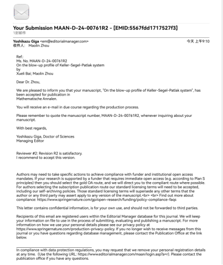 近日,beats365官网入口分析与几何研究团队青年教师白学利教授与南开大学周茂林教授合作,在Keller-Segel-Patlak模型的解的爆破形状精确刻画方面取得突破,研究结果“On the blow-up profile of Keller-Segel-Patlak system”被数学综合期刊Mathematische Annalen接收,这是公司继姚磊教授之后再次在该著名数学综合期刊发文。