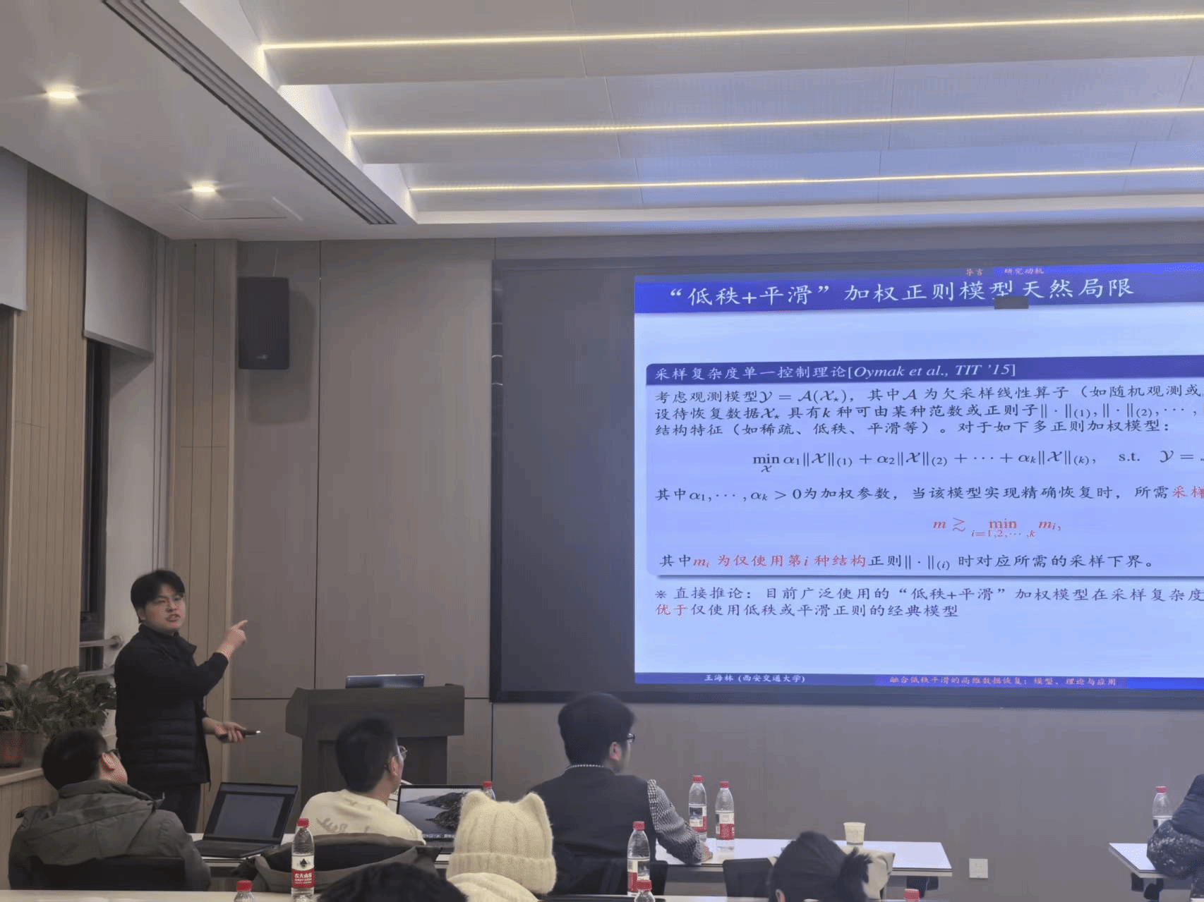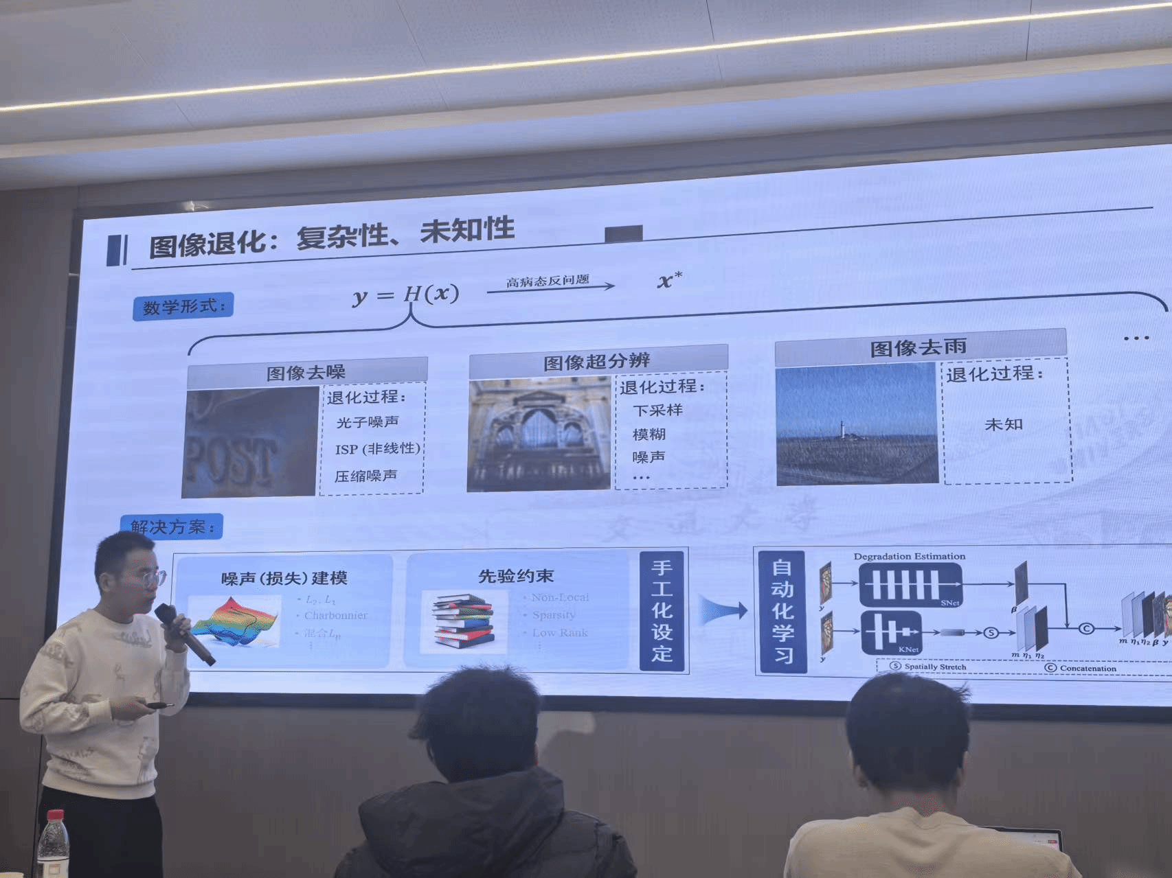 会议核心报告环节,四位专家学者带来了极具前沿性的学术分享。beats365官网入口栗帅教授以“基于生成模型的真实图像超分”为题,深入探讨了语义信息引导、变分自编码迁移学习及强化学习在图像超分辨率问题中的创新应用,为解决真实场景下的图像退化难题提供了新思路;西安交通大学王仁振助理教授针对半监督学习的分布偏差问题,介绍了偏差自适应分类模型与异方差伪标签建模方法,有效提升了模型在复杂环境中的泛化性能与稳健性;西安交通大学岳宗胜教授聚焦图像复原的“自动化”与“通用化”建模,其研究成果已成功应用于华为旗舰手机影像系统,实现了技术落地与产业赋能;西安交通大学王海林博士分享了融合低秩平滑的高维数据恢复研究,提出的全新建模方法在图像视频处理、异常检测等多领域展现出优越性能。报告结束后,与会嘉宾围绕研究热点、技术难点展开深入研讨,形成了多项建设性共识。