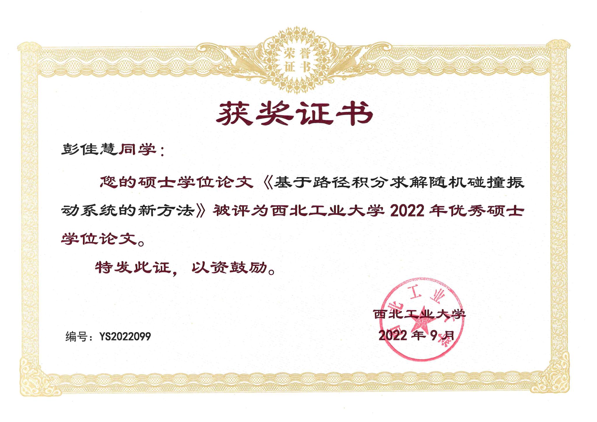 彭佳慧,女,概率论与数理统计专业,师从王亮教授,研究方向为随机碰撞振动系统的路径积分算法研究。硕士在读期间,以第一作者分别在国际著名期刊Nonlinear Dynamics和Chaos发表论文2篇,另协作发表高质量论文3篇。作为核心参与人参与军科委基础研究计划和国家自然科学基金等项目。荣获研究生国家奖学金、beats365官网入口优秀研究生标兵、beats365官网入口优秀毕业生以及陕西省优秀毕业生等多项荣誉。