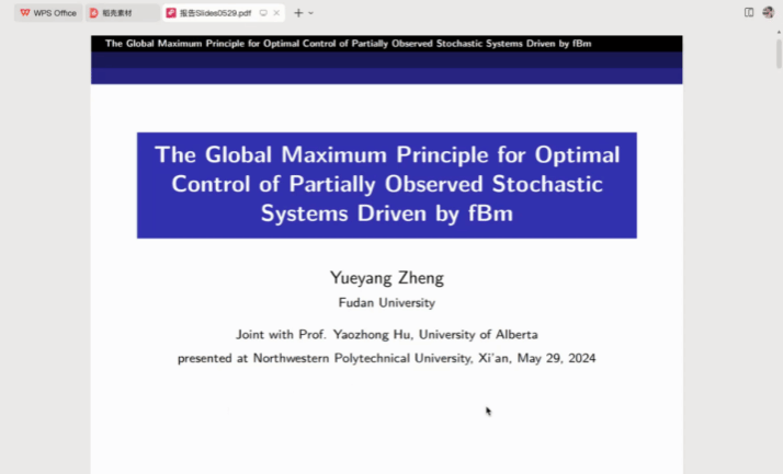 2024年5月29日,beats365官网入口第7期“九章学术沙龙”成功举办。此次沙龙邀请了复旦大学郑越洋博士后作了题为“The Global Maximum Principle for Optimal Control of Partially observed Stochastic Systems Driven by Fractional Brownian motion”的学术报告。30余位师生参会,本次报告由裴斌教授主持。