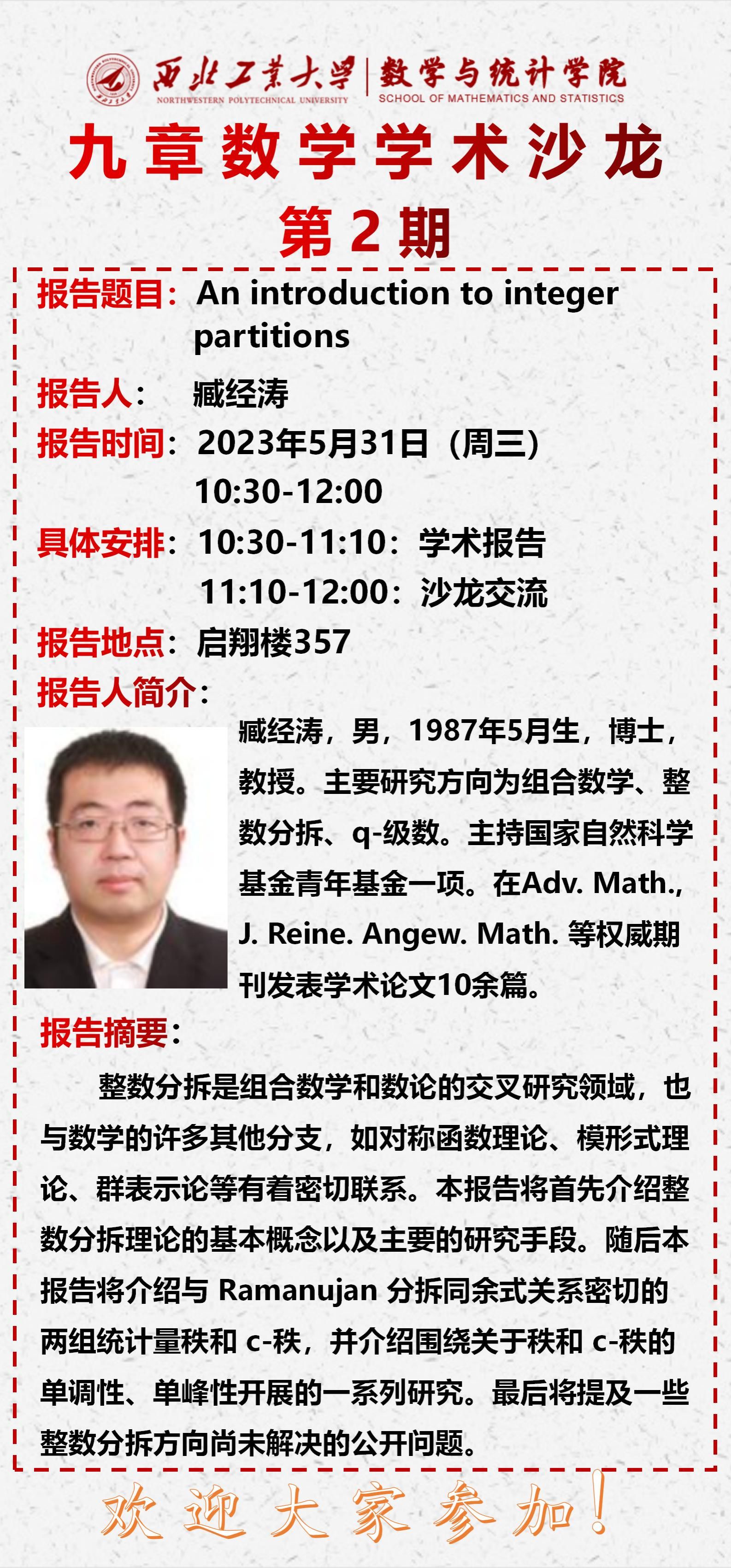 2023年5月31日,beats365官网入口第二期“九章数学学术沙龙”在启翔楼357举行。beats365官网入口臧经涛教授做了题目为《An introduction to integer partitions》的报告,都琳副经理、钮鹏程教授、陆由教授、以及公司20余位教师和员工参加,会议由二级学科负责人白延东副教授主持。