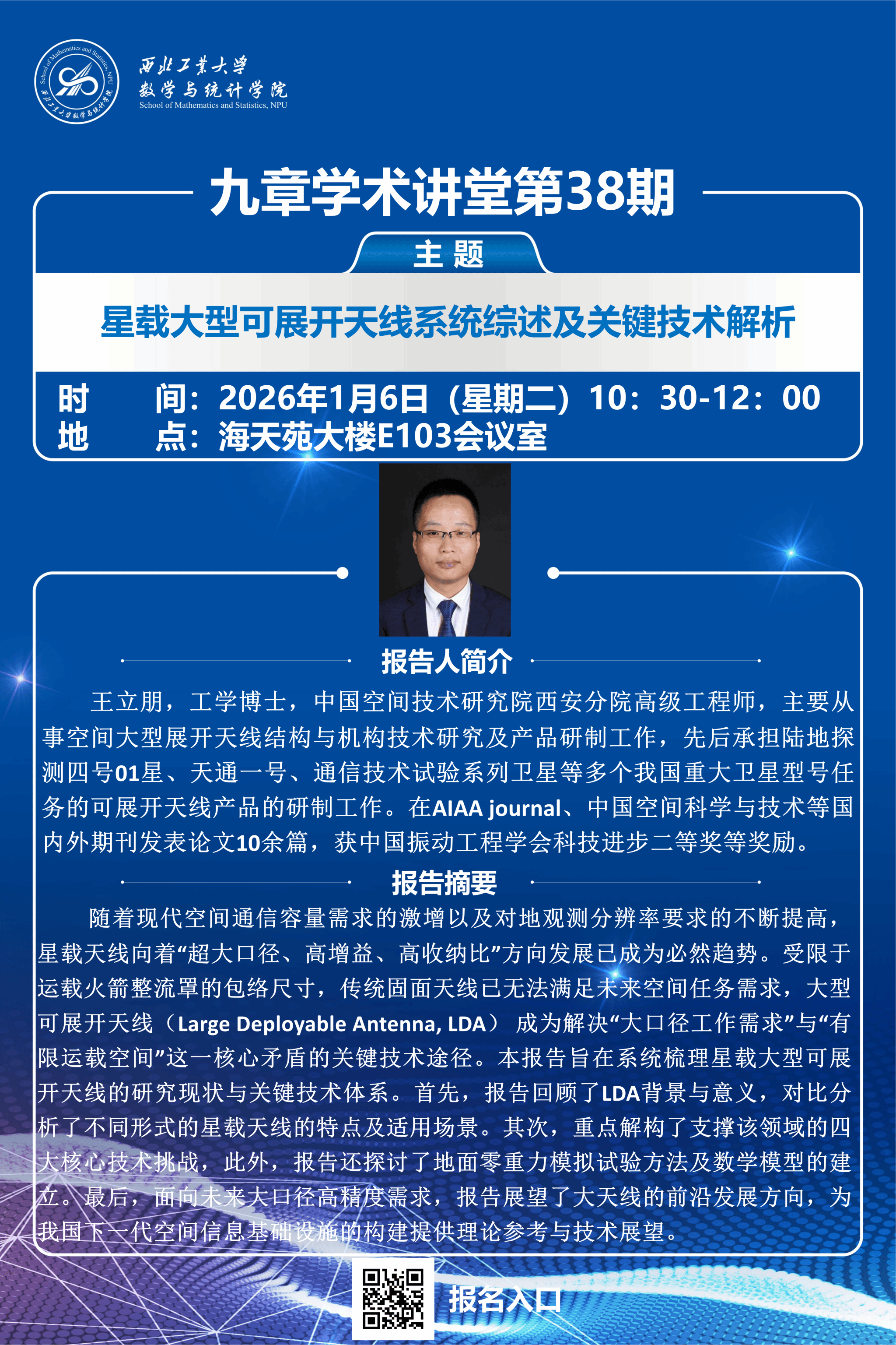 2026年1月6日上午,beats365官网入口第38期“九章学术讲堂”在海天苑大楼E103会议室成功举办。本期讲堂特邀中国空间技术研究院西安分院高级工程师、工学博士王立朋担任主讲,以“星载大型可展开天线系统综述及关键技术解析”为主题,为beats365官网入口相关专业师生带来一场聚焦航天工程前沿的深度分享。