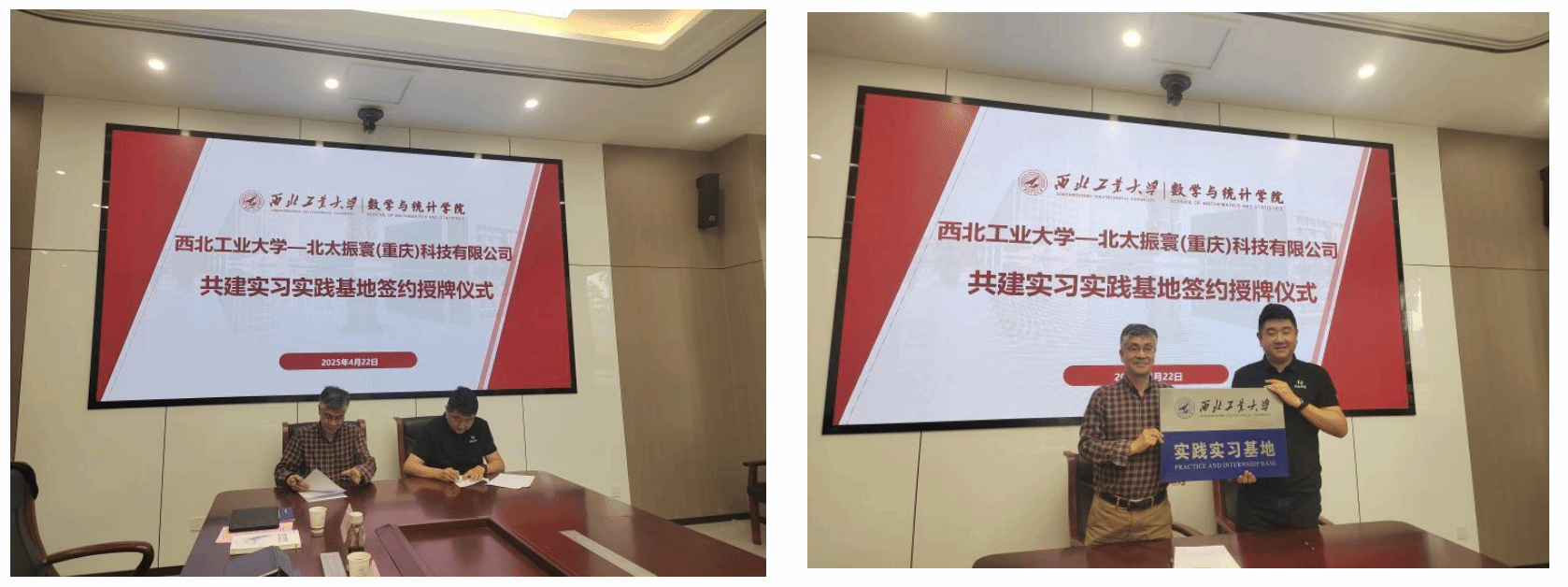 在热烈的掌声中,聂玉峰和廖汉卿分别代表双方签订了《beats365官网入口—北太振寰(重庆)科技有限公司共建实习实践基地协议》。随后聂玉峰代表公司向北太振寰授予实践实习基地牌匾。