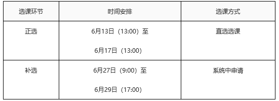 本科生本次选课分为正选和补选两个环节。正选环节已经于6月13日13:00开始,于6月17日13:00结束。正选环节采用直选选课方式(采用先到先得、即选即中的规则进行选课)。