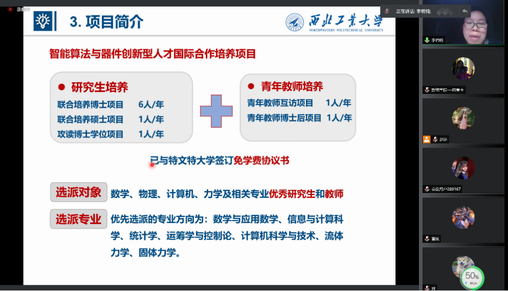 公司国际合作处张宇主管围绕公司设置的本科生与研究生国际化项目以及相关员工出国支持政策进行了介绍,并强调了国合处近期发布的beats365官网入口国际化领军人才培养项目,希望有相应出国交流意向的同学可以积极报名,同时简要介绍了与英国布里斯托大学拟签订的3+1项目。最后,公司李若楠和赵倩两位老师针对公司近两年申请到的国家留学基金委公派留学的两个项目做了宣讲,分别从合作项目的国外高校基本情况、合作基础、选派类别、时间、要求进行了详尽细致的阐述。同时,来自公司小语种培训中心的耿妍老师还对俄罗斯文化与俄语语言学习做了简要介绍,使参会师生更加了解俄罗斯的风土人情、科研实力以及俄语语言特点,为公司推进俄乌白公派项目的选派工作起到了非常重要的积极作用。
