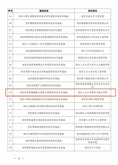 The Science and Technology Bureau of Xi'an (the Foreign Expert Affairs Bureau of Xi'an) recently announced the recognition of the fifth batch of Xi'an International Science and Technology Cooperation Bases. Among them, the "Xi'an International Science and Technology Cooperation Base for Complex Data Modeling and Intelligent Computing," led by the School of Mathematics and Statistics, has been officially approved.